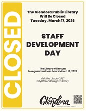 The Glendora Public Library will be closed on Tuesday, March 17, 2026, for Staff Development Day. The Library will return to regular business hours March 18, 2026.